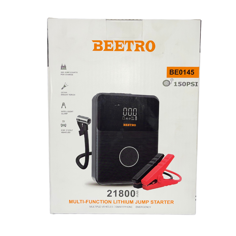 Booster batterie 2000a Power Bank 28100mah + compresseur 10bar avec torch de la marque Beetro original dans une pochette avec des pinces de chargeur + des cable pour powerbank et les outils de gonflage
