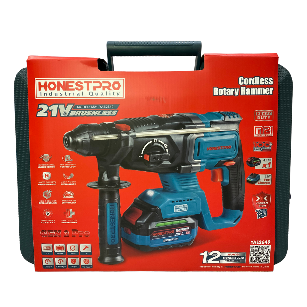 MARTEAU PERFORATEUR SDS PLUS SANS FIL ( A BATTERIE ) DE LA MARQUE HONESTPRO 2.8J – 1100RPM AVEC UNE BATTERIE 21V – 4A + CHARGEUR RAPID + 3 MECHES , 2 BURINS